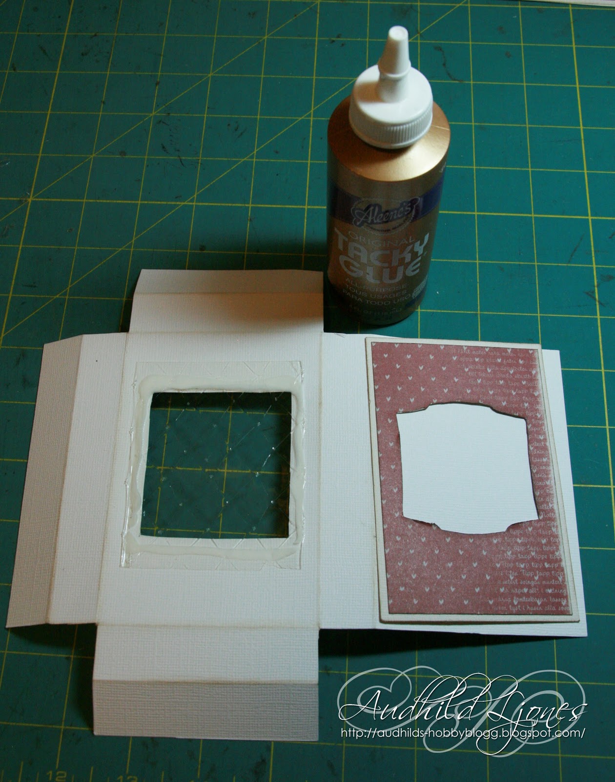 Glue the pattern paper over the gelantine window. Glue the box together, and put it inside the card.